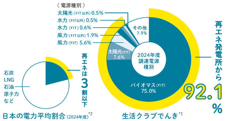 *1 生活クラブでんき:「その他」は、旧一般電気事業者からインバランス(補給)供給を受けた電気と他社から調達している電気の一部で発電所が特定できないものです。なお、「その他」に入る日本卸電力取引所の電気には、火力、水力、原子力、FIT電気、再生可能エネルギーなどが含まれます。/エネルギー供給構造高度化法に定められた非化石証書を一部利用しています。