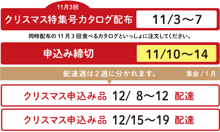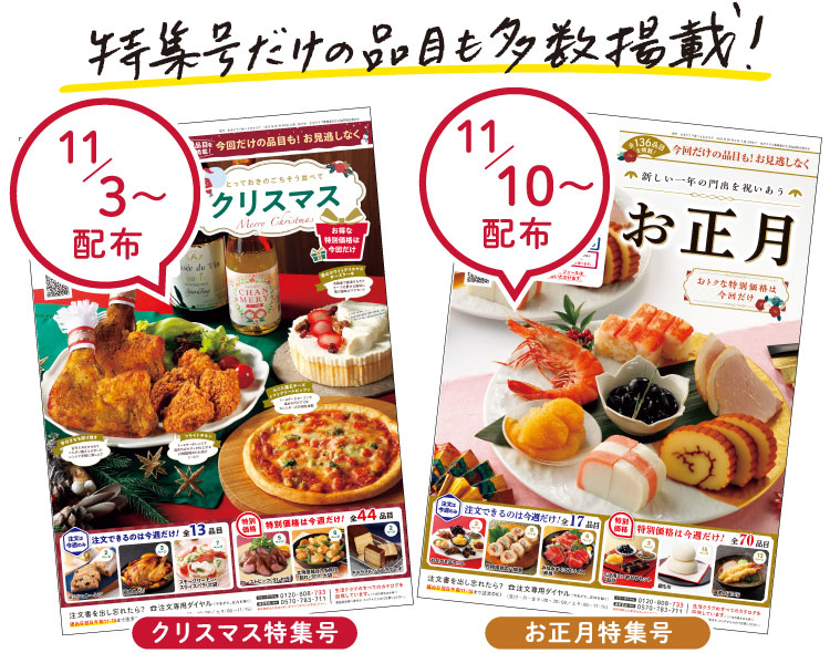 「クリスマス特集号」(11/3~)と「お正月特集号」(11/10~)を2週連続で配布します。このカタログでしか注文できないものや、おトクになるものも多数掲載。すべての品目を紹介するのは、それぞれのカタログのみです。早めに申し込んで、おトクにおいしくクリスマス・お正月を過ごしましょう。