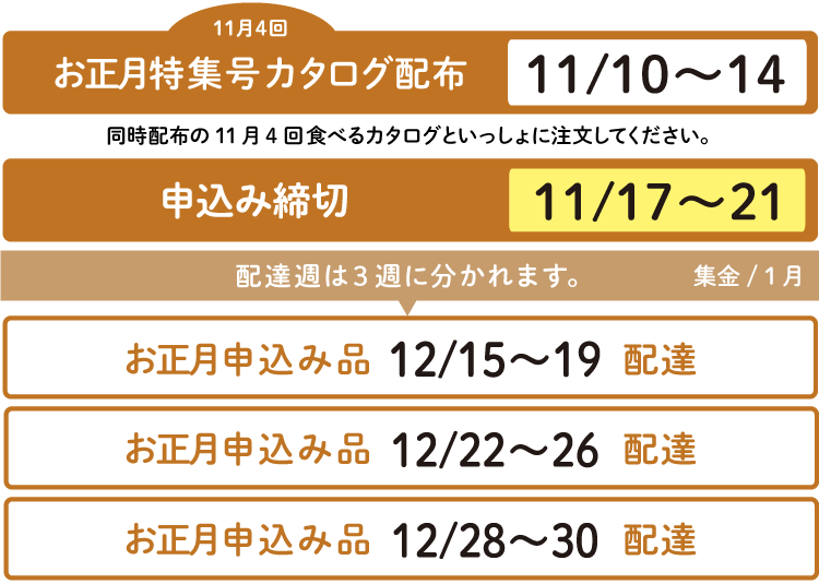 クリスマス・正月用品の消費材品目と注文・配達の日程は、この記事の記載と一部異なる場合があります。ご所属の生協から届くカタログ、ニュースなどでお確かめください。