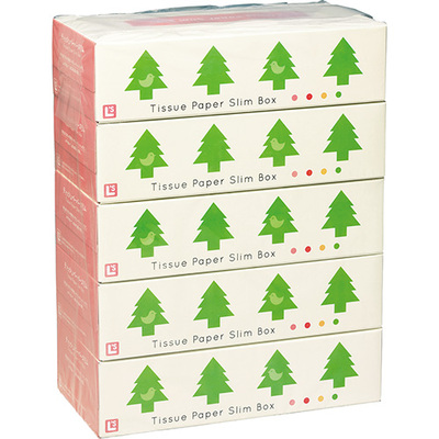 限りある資源を有効に活用するため回収古紙を原料としています。ペーパーや箱のサイズをできる限りスリムにしました。ひと箱に400枚(200組)入り、5個パックです。