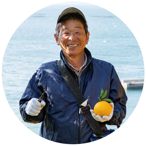 熊本県水俣市の不知火(しらぬい)海を背に、「みかんと言葉は交わせないけど、手間をかけた分だけ、おいしく応えてくれるんです!」と笑顔を見せる緒方さん。