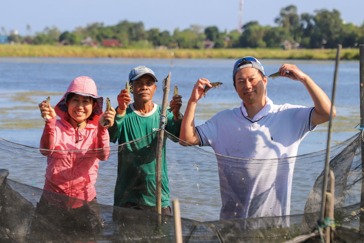 今回の訪問で養育場に約1cmの稚えびを放流しました。一部の生産者は、稚えびの生存率を高めるための工夫として、親えびから採卵・ふ化させた後、養育場で約2 cmまで成長したえびを調達して養殖池に放流しています。