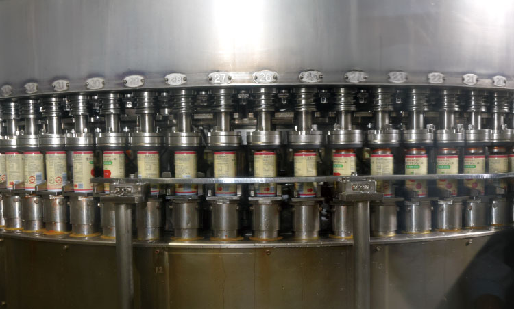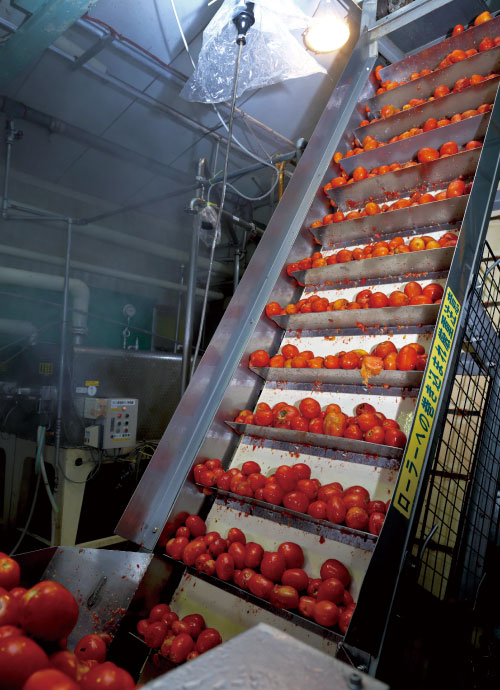 工場長、市川公一さんの案内で製造工程をたどる。3段階の洗浄工程を経て、トマトの傷んだ部分を手作業で取り除き、ハンマークラッシャーで粉砕。遠心分離機とふるいでタネと皮を除去し、果汁を一旦タンクに入れて糖度や㏗(酸性、アルカリ性の程度)を測定する。品質検査で合格となったら短時間で高温殺菌し、缶に詰めていく。充填機の処理能力は1分間に平均850缶。底に賞味期限を印字し、ケースに納めれば製品の完成だ。