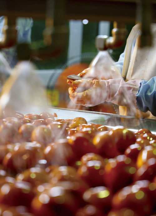 「おいしさの秘密は、なんといってもシーズンパックにあります」。雪印メグミルク㈱広域営業部の田角(たづの)英明さんはそう言い切る。生活クラブの提携生産者である同社は、信州トマトジュースをはじめとして野菜ジュース、りんごジュースなど長野興農が生産する飲料の流通販売を担う。シーズンパックとは、一年に一度、野菜や果物が一番おいしい季節に収穫し、果汁をしぼり、そのまま缶などの容器に充填(じゅうてん)する製法のこと。長野興農は、県内の畑で熟したトマトを収穫から最短で翌日、遅くとも4日以内に製品化する。そこにおいしさの秘密があるというわけだ。
