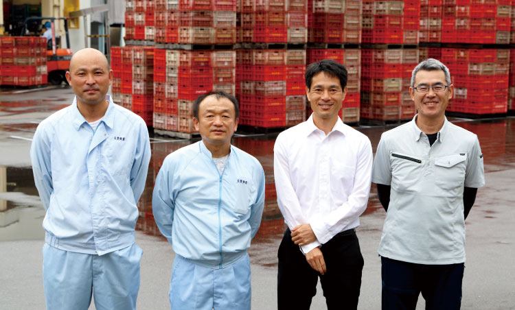 長野興農長野工場長の市川公一さん(左から2番目)と職員のみなさん。運び込まれたトマトのコンテナの前で