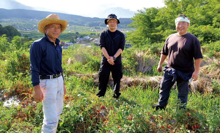 右から、雪印メグミルクの田角英明さん、長野興農の原晋一郎さん。山田豊さん(左端)のトマト畑で
