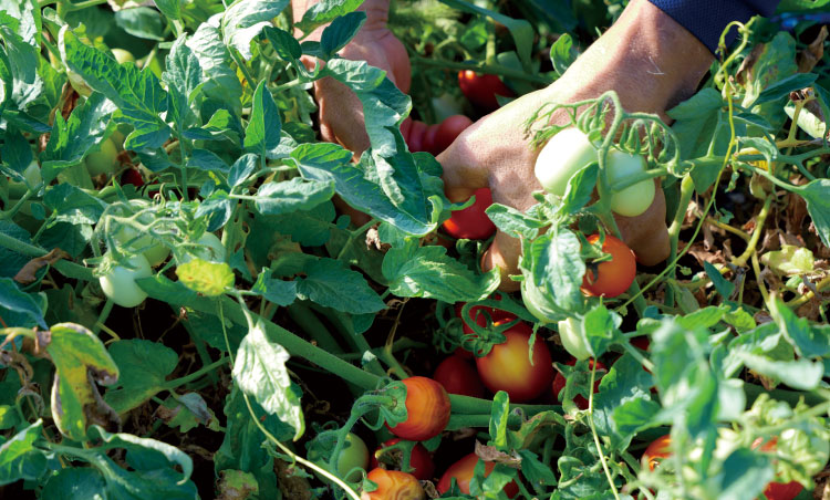 8月上旬、トマト畑に強い日差しが降り注ぐ。支柱仕立ての生食用のトマトとは違い、加工用トマトは地面を這うようにツルを伸ばし、房の先についた実から順番に熟れていく。ここ数年の酷暑、激暑だ。腰をかがめ、太陽の照り返しを受けて、一つ一つ手で摘み取る加工用トマトの収穫作業は年々過酷さを増している。