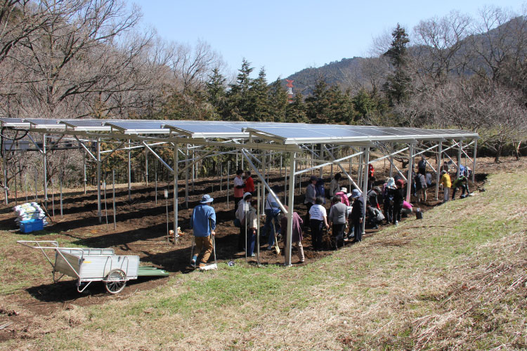 中でも生活クラブ神奈川ではさまざまな団体やワーカーズ・コレクティブ、そして500名を超える組合員より、130万円のカンパが集まりました。また、建設の一部資金調達と事業の安定性や継続性を鑑み、2回のクラウドファンディングを実施し、合計600万円の資金調達ができました。この資金をもとに、新しいソーラーシェアリングの農地にワイン用ブドウの植樹を行ないました。生活クラブでは、農業・観光・教育の機能をもつ、今までにない発電所をつくり、地域の活性化をめざし、「食とエネルギーのテーマパーク」の実現をすすめてまいります。