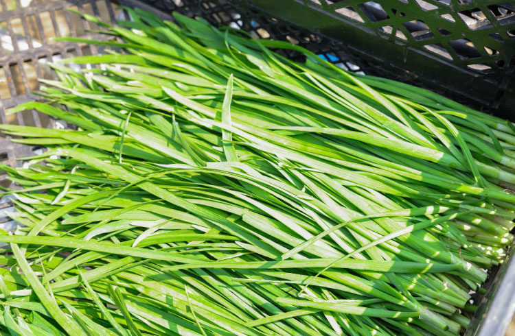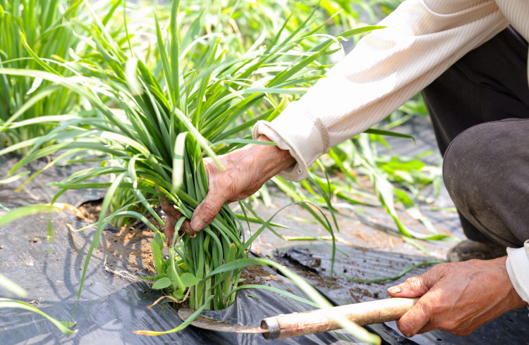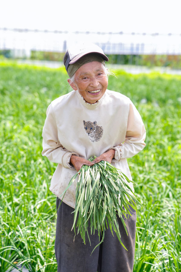 餃子を生産・製造する美勢商事株式会社は、具材に使用している野菜の一部(ニラ、キャベツ等)を自社グループで栽培しています。無農薬で育てているニラ栽培は、ぐんぐん成長する雑草との闘いです。そんなニラ栽培の現場で活躍しているのは美勢商事の関連会社・きららファーム株式会社の従業員・大野田美代子さん(81歳)。大野田さんは美勢商事の餃子工場を退職後、ニラ栽培の生産現場へ再就職しました。腰をかがめながらの作業がメインですが、雑草の引き抜きも、ニラ収穫もすべて手作業で行なっています。「大野田さんの雑草取りは誰よりも完璧」と社長も太鼓判を押しており、刈ったニラも綺麗にそろえられ美しいほどです。大野田さんのこうした丁寧な仕事ぶりが生活クラブの餃子を支えています。
