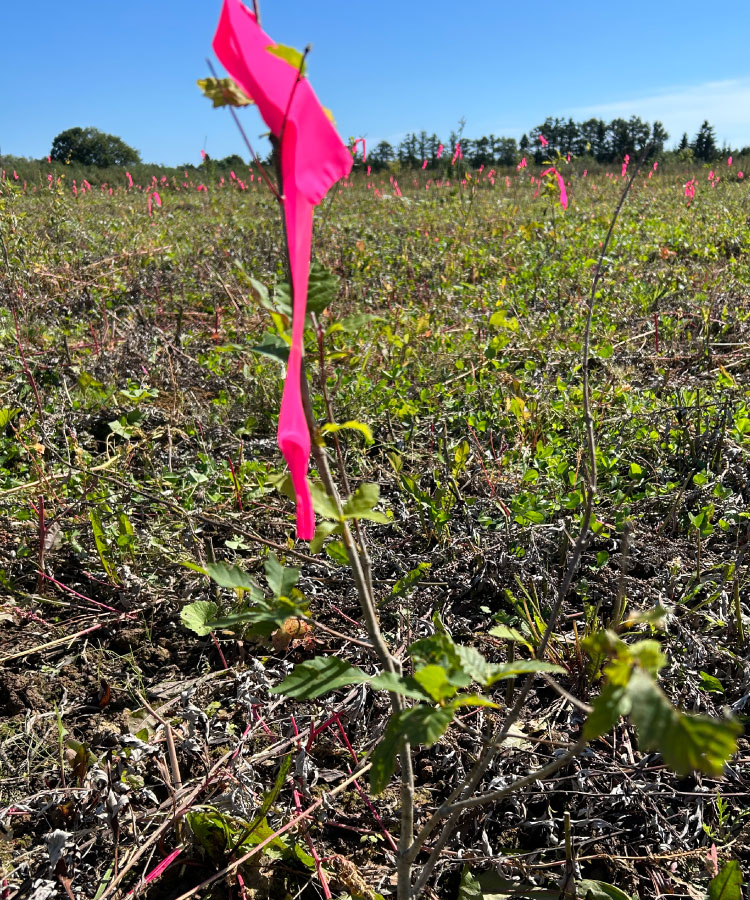 植えた樹木に目印のリボンをつけ、草取りのときに刈らないようにします
