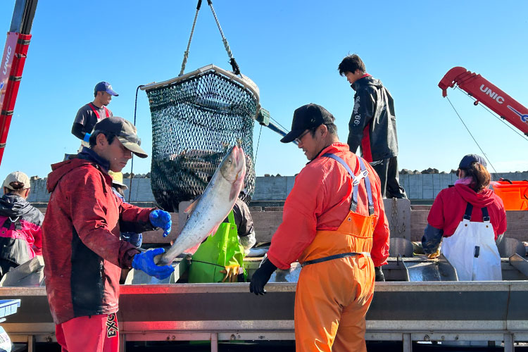 秋鮭の水揚げも見学しました。沿岸付近に仕掛けておいた網に回遊してきた秋鮭を誘い込み、袋状の網に閉じ込めて漁獲する「定置網漁」と呼ばれる漁法です。船が入港してくる直前に漁家の家族などたくさんの人が集まり、総動員で素早く選別・出荷していきます。秋鮭は川から海へ渡り生まれた川に戻ってくる習性がありますが、近年は海水温の上昇などによって遡上するルートが変わったのか網にかかる鮭が年々減っているといいます。