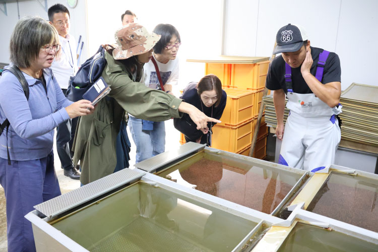 訪れた「幌内さけ・ます孵化場」で、受精卵が育成されている水槽を見学する組合員