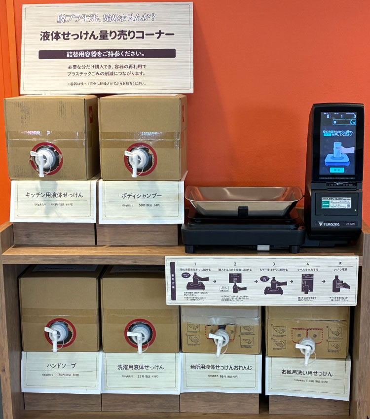 量り売りをするのは、ハンドソープ、ボディシャンプー、キッチン用液体せっけん、洗濯用液体せっけんの4品目で、生活クラブ千葉のデポーではこれに台所用液体せっけん おれんじ、お風呂洗い用せっけんを加えた計6品目です。