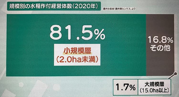 「コメはもとより、38パーセントの低水準にある食料自給率を高めるための増産というなら大賛成です。しかし、そのための農業構造転換の基軸が農地集積による大規模化とAI(人工知能)とIT(情報通信技術)を融合した機械化にロボット化、さらには輸出支援である点が何とも実に気になります。この点は何度も口が酸っぱくなるほど申し上げてきました。なぜなら、日本は急峻(きゅうしゅん)な地形が多くて平野に乏しい地形で、コメ農家の平均耕作面積も2ヘクタール台とオーストラリアの水田1枚(50ヘクタール)の25分の1ほどの広さだからです。日本にも50~100ヘクタール規模の面積を耕作する法人は存在しますが、それは限られた地域と農家の話ということになり、圧倒的多数を占める中小の家族農業経営者(図1参照)への有効な支援を念頭に置いた施策とは言い難いと私は見ています。しかも、経営面積が100ヘクタールの稲作農家のなかには田んぼの枚数は450枚を超えると話してくれた人もいます。大規模経営といえども、オーストラリアとはまったく別世界なのです。