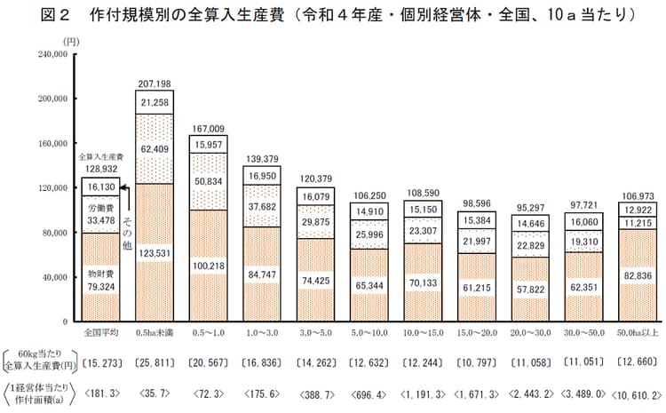 先の北海道の大規模稲作農家でも『1俵のコメ(玄米60キログラム)を作るには、最低でも2万~2万5000円の生産コストが必要』と言います。現在、日本の稲作の生産コストは相当に上昇しているということです。必ずしも農地集約による大規模化が生産コストを引き下げ、廉価なコメの安定供給に資すると言い切れないわけです」