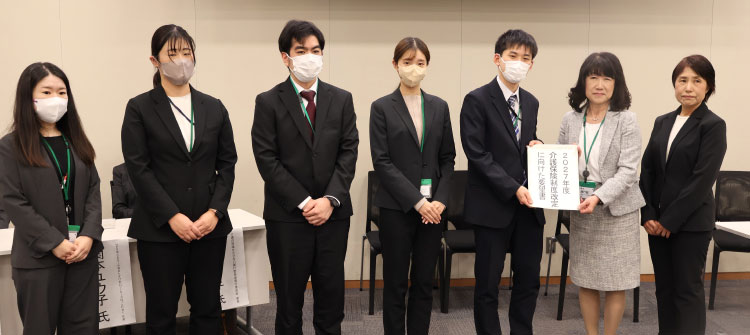 会場には立憲民主党の大河原まさこ氏、小山展弘氏、長谷川かいち氏、まのさとし氏、いちき伴子氏、大塚さゆり氏、かわはらだ英世氏、国民民主党の小林さやか氏、日本共産党の田村貴昭氏、れいわ新選組の天畠大輔氏、社民党の福島みずほ氏、ラサール石井氏ら国会議員の参加も多数あり、「介護制度を崩壊させないために手を取りあいましょう」「これからも、ともに訴えていきましょう」と力強いお言葉をいただきました。集会の終わりには参加者を代表して生活クラブ共済連の小寺浩子氏と並木道代氏から、厚生労働省に要望書を提出しました。