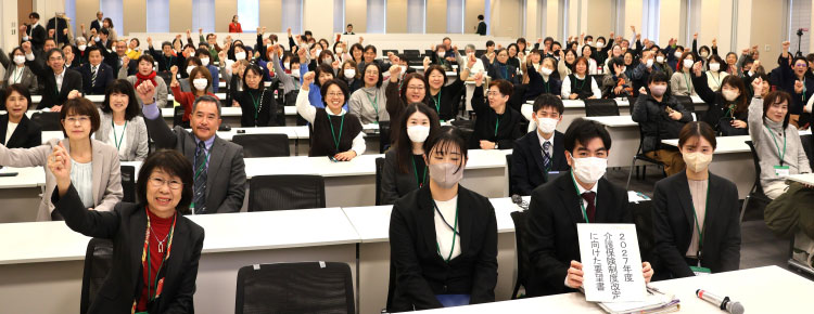 介護職員の人材確保は待ったなしです。2026年には240万人、2040年には272万人の介護職員が必要となります。介護職は利用者の命を支える専門職であるにもかかわらず、全産業の平均給与よりも約7万円も低いのが実状です。処遇改善加算と国は言いますが、それは一時的なことであり、取組みが15年たった今も、実質的な賃上げに全くつながっていないことは歴然たる事実です。このままではサービス、事業所の存続も難しいのが現状です。すでに、「制度はあってもサービスはなし」という状況を突きつけられています。改めて、被保険者の保険料負担が過重とならないよう、介護の担い手が持続可能なものになるよう、財政支援、国費による負担割合の引き上げを強く望みます。