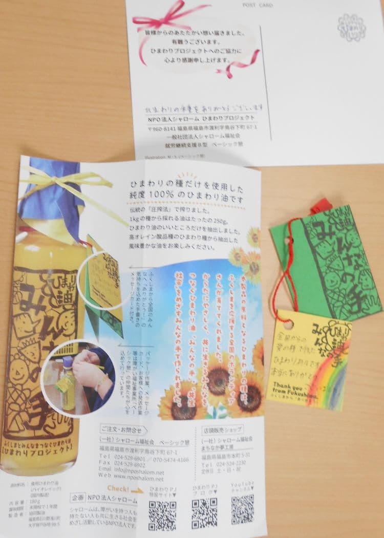 みんなの手でつくられたひまわり油には手書きのメッセージが添えられています