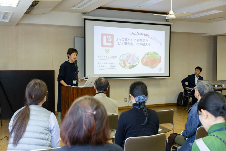「L‘s選定品」について説明する、開発プロジェクトメンバーの組合員・津田尚子さん