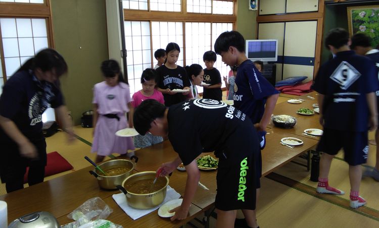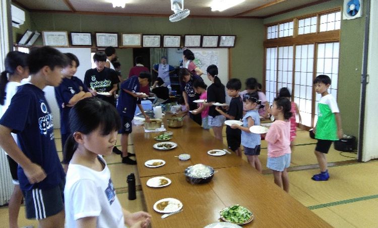 この日の献立はカレーライス!テーブルにはみんなで育てたじゃがいもでつくった山盛りのポテトサラダ。野菜部担当の指導のもと、自分たちで種まきから収穫までおこないました。野菜農家から規格外の提供もあり、ナスの炒め物やきゅうりの漬物なども並んでいます。こうした野菜の提供のおかげで材料費をかなり抑えられているとのことです。