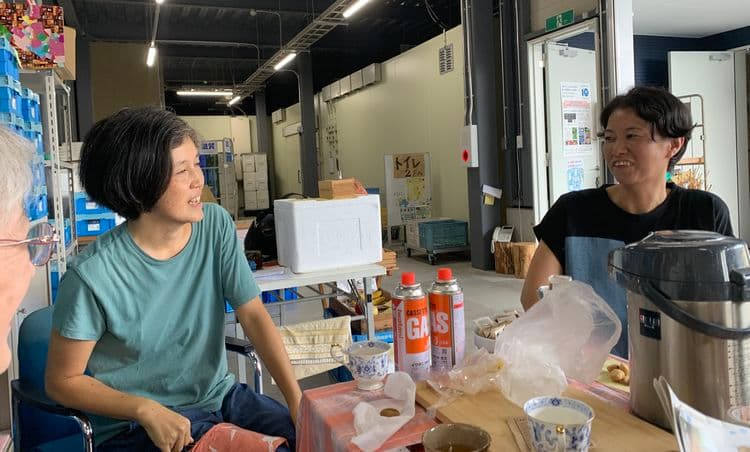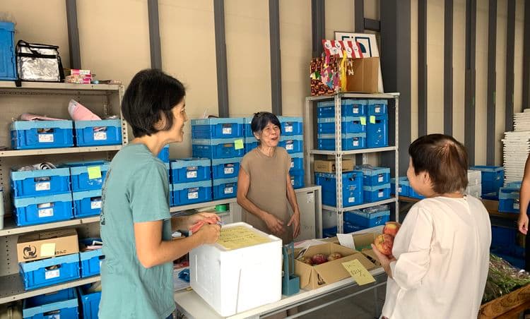 留め置き班のスタッフは、秋久保由紀さん(生活クラブ滋賀 理事長)や堀本もも子さん(生活クラブ滋賀 組合員)らを中心に4~5人。朝の仕分けから始まり、組合員が三々五々やって来るなか、消費材の受け渡しを通じて交流もします。