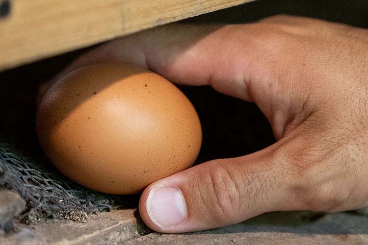 採卵鶏は生後150日で産卵を始め、210日で産卵のピークを迎え、長くとも生後3年以内で淘汰されるのが一般的です。この点は自然卵養鶏もほぼ同じです。ただし、寿命の長さが少し異なります。自然卵養鶏では産み始めが生後180日齢(およそ6ケ月)、270日前後でピークを迎え、そこから700日齢(およそ2年)産み続けてくれます。ちなみに、当養鶏場の場合は240日齢程から産卵が始まります。なぜ、産み始めが異なるのか。一般的な養鶏場では完全配合飼料と呼ばれる粉状の濃厚飼料をエサにして飼育しています。自然卵養鶏では各農家が自家配合して作る発酵飼料を中心とした粗飼料になります。このエサは粉状にはなっておらず、鶏自らが咀嚼(そしゃく)し消化しなければならないものばかりです。そのおかげで、鶏の腸内は活発に活動し、砂肝も消化のために発達し通常よりも大きく成長します。こうした腸内運動と連動し、たくさんの運動を鶏舎内で行うため、体がしっかりと成熟し始めて、たまごを産み始めることになります。産み始めが遅ければ遅いほど、長い期間たまごを産み続けてくれます。自然卵ではおおよそ8割産卵をキープできれば御の字で、これくらいのペースで十分なのです。
