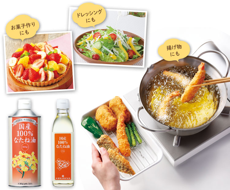 現在、原料に“ペノカのしずく” を使った「国産100%なたね油」への切り替えが始まっています。