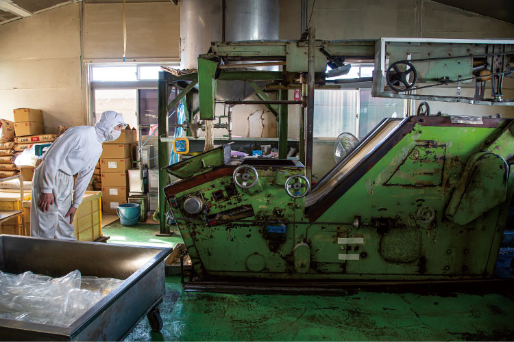 「製品の特徴に合わせて粉を選びますが、産地や品種によっては、小麦粉の性質が同じというわけにはいきません。自分たちでそれぞれの小麦粉の特徴を見極め、それに合わせて加える水の量や練り方を変え、砂糖や油脂の配合の比率を決めています」と、専務取締役の石崎竜太さん。国産の小麦粉を使うために、製造方法をさまざまに工夫している。