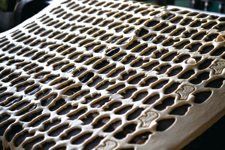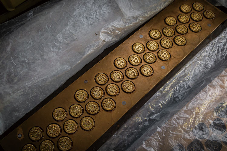 クリームサンド黒ごまビスケットの金型。鉄製の金型は約200キログラム。製造する焼き菓子ごとに交換する