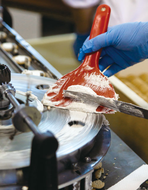 人の手をかけて製造するクリームサンド黒ごまビスケット。クリームは乳化剤を使わず、油脂と砂糖を練り上げる