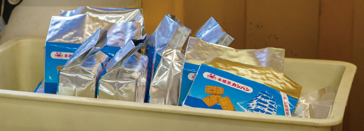 カニヤの黒ごま入りの乾パンは、そうした歴史を受け継ぎ、今も主食としての役割を十分に果たす。長方形で手のひらぐらいの大きさの乾パンは、場所をとらずに保存でき、携行・輸送にも便利だ。賞味期限は3年間と長く、気象災害や地震などの非常時の保存食として活用され、官公庁や全国の自治体などに納められている。
