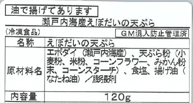 1月1回に配達された「瀬戸内海産えぼだいの天ぷら」のうち、誤ったラベルが貼られている製品は3点です。いずれも中身については正規品です。