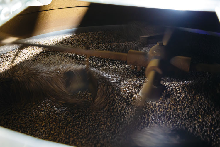 実物(みもの)焙煎は高温で行う。ハトムギの焙煎が始まると、香ばしい香りが漂う