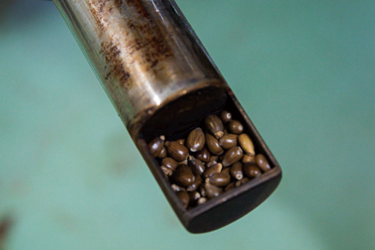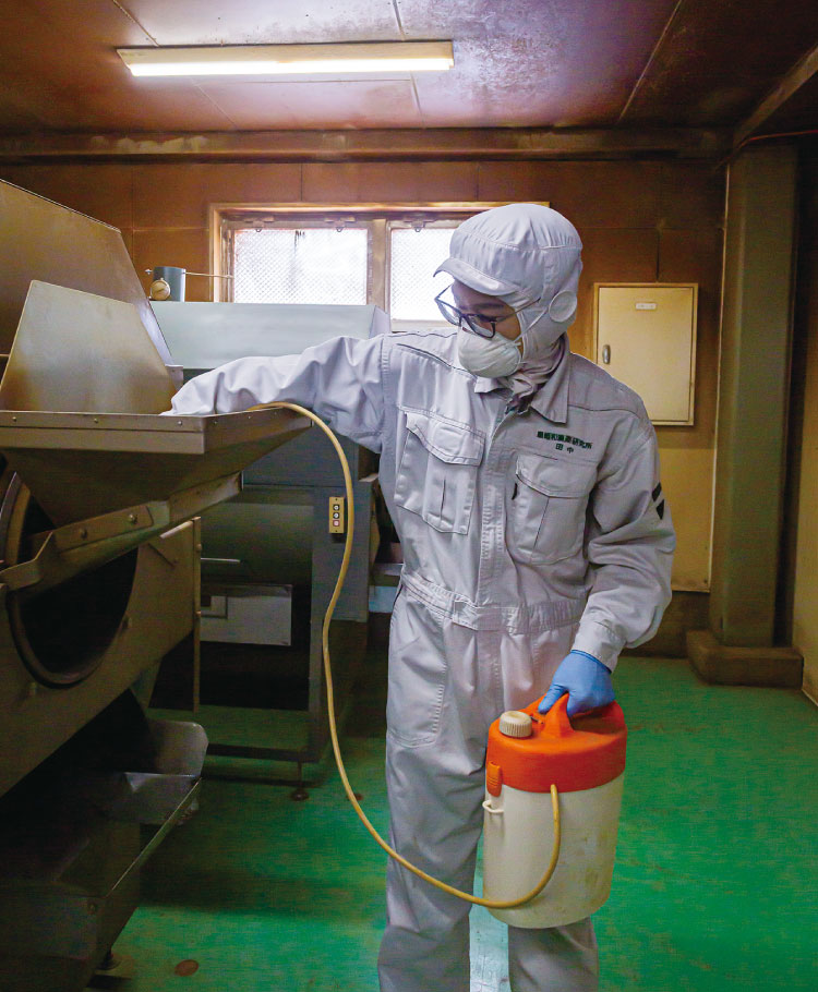ハトムギ、クロマメなどの実を使う物は、熱風とじか火を使い高温で焙煎する。焙煎も行っていた工場長の中山真史(まさふみ)さんが、「それぞれの実の状態を確かめ、粉砕後の味までを想像して焙煎時間を調整します。その日の天気や、気温、湿度も大きく関係します」と言う。