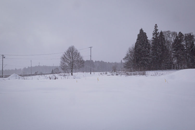 1月の黒姫山麓。アマチャは雪に覆われて冬を越す。雪に保護され、凍結することなく春を迎える