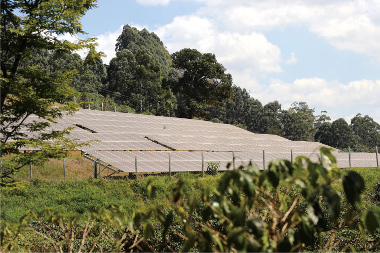 コーヒー栽培に適した山岳地帯にあり、アボカドやユーカリ、アフリカンマホガニー、バナナなど、さまざまな木を5000本以上植えて、そのもとでコーヒー栽培をしています。太陽光発電の設備をもうけて農園で使用するすべての電気をまかなっています。