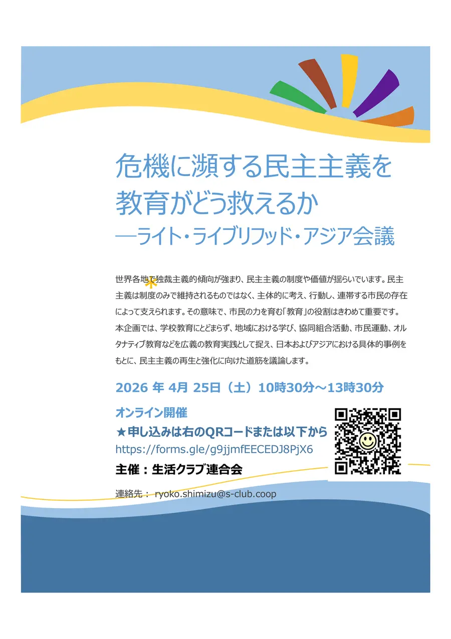 本企画では、学校教育にとどまらず、地域における学び、協同組合活動、市民運動、オルタナティブ教育などを広義の教育実践として捉え、日本およびアジアにおける具体的事例をもとに、民主主義の再生と強化に向けた道筋を議論します。