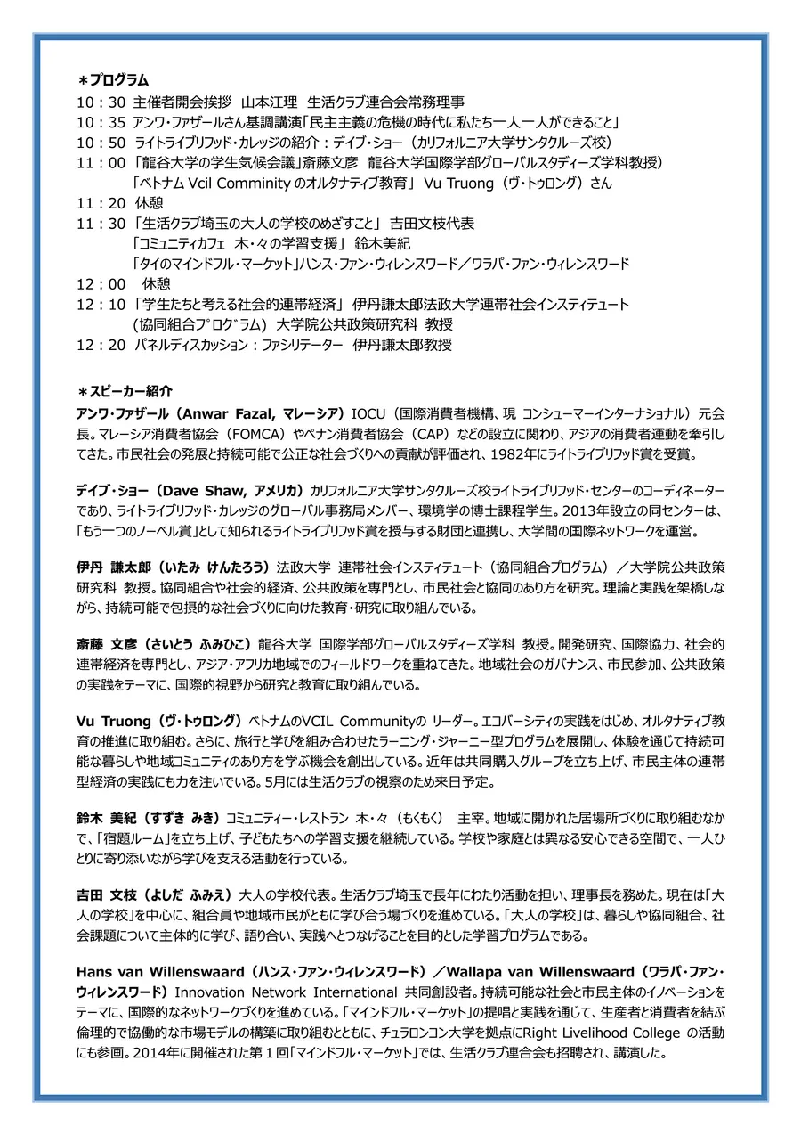 11:30 「生活クラブ埼玉の大人の学校のめざすこと」 吉田文枝代表