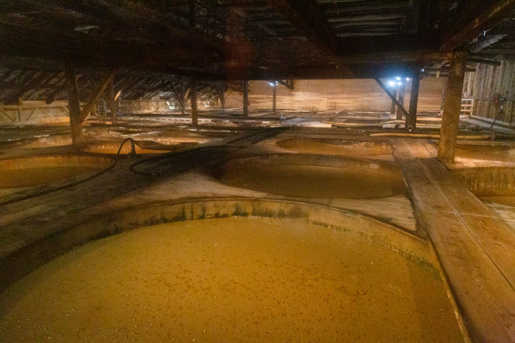 醤油こうじに食塩水を混ぜた“もろみ”の熟成。タイヘイには110本以上ものどっしりとした木桶が並びます。