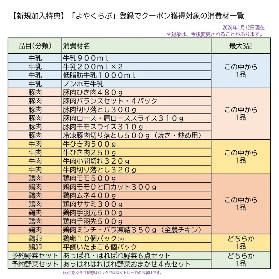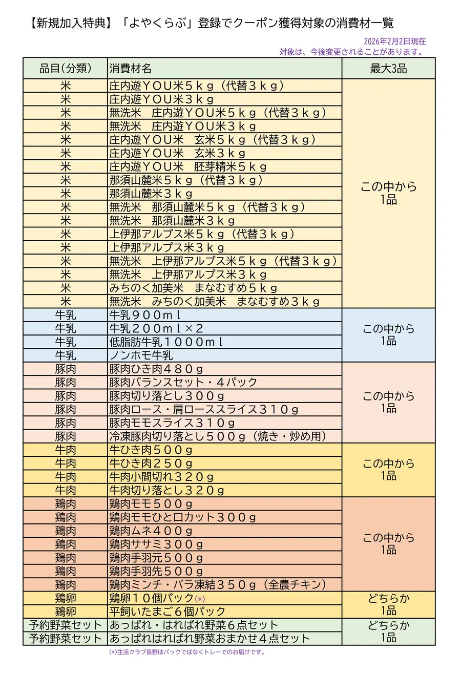 ※対象となる予約登録は、米・牛乳・豚肉・牛肉・鶏肉・鶏卵・予約野菜セット の各品目グループから1品ずつ、最大3品の登録です。